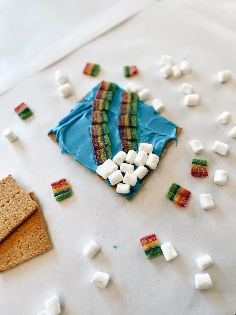 Of course, out of every activity we did, they loved this one the best. Anytime things involve sweets that they get to eat, it's a win. For this we used airhead rainbow bites, mini marshmallows, blue frosting an graham crackers.
