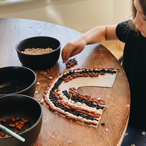 Using a cereal box, I freehand cut a rainbow shape. Then, the kids glued a variety of beans, making six sections to represent the six colors of the rainbow. After the glue dried, they painted each line of beans in the correct color order of a rainbow.